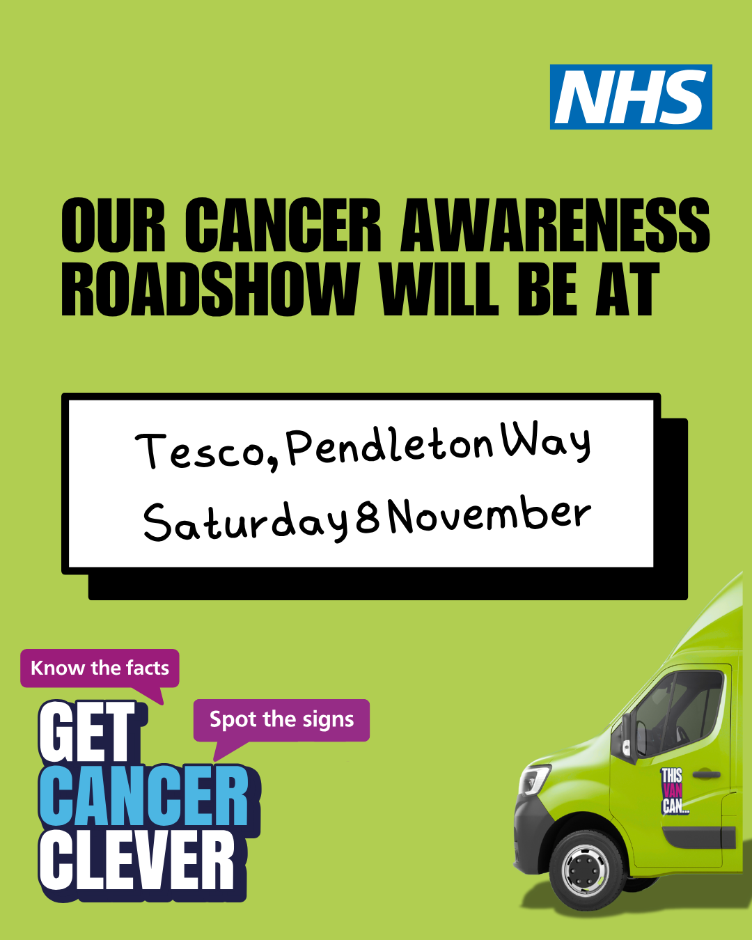 The NHS cancer awareness roadshow will be at Tesco’s on Pendleton Way on Saturday 8th November 2025. Why not pop along for a chat with our friendly staff, who can help you “Get Cancer Clever”.
